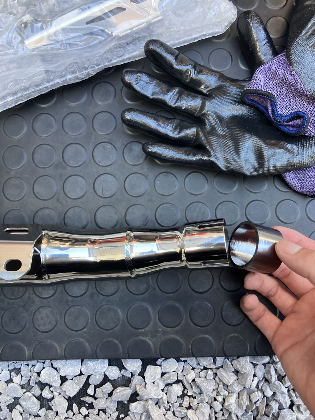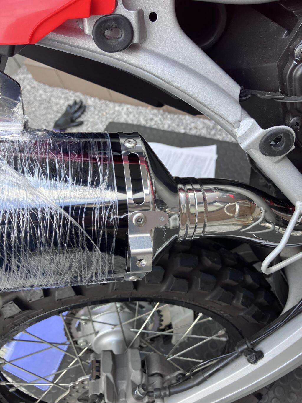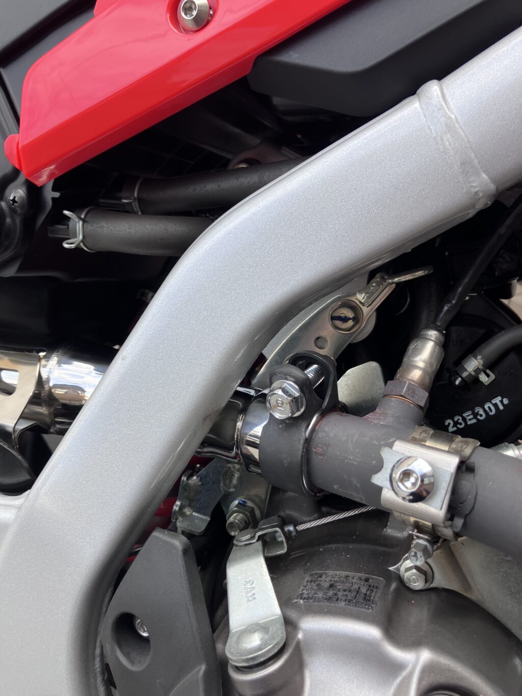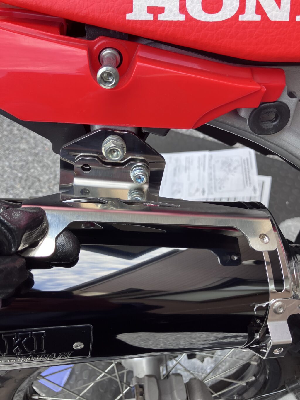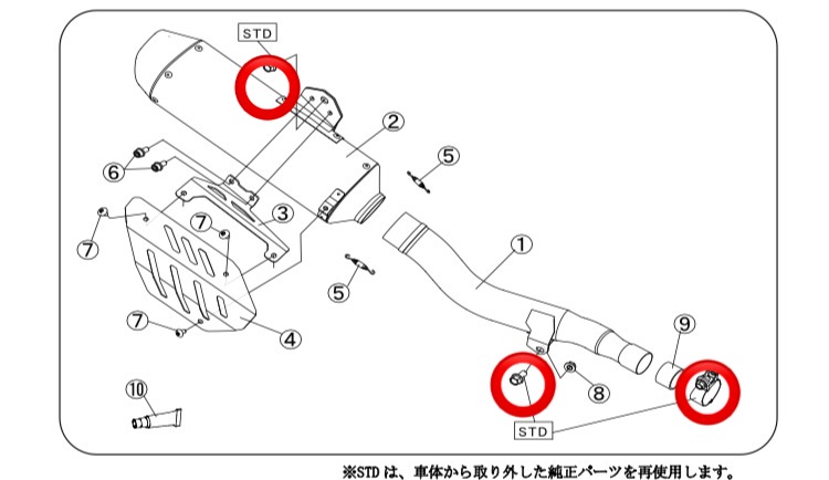 たけお説明書記載の通りですが、標準マフラーで使っていた締込みバンドとボルト2個はそのまま流用するのでご注意ください!