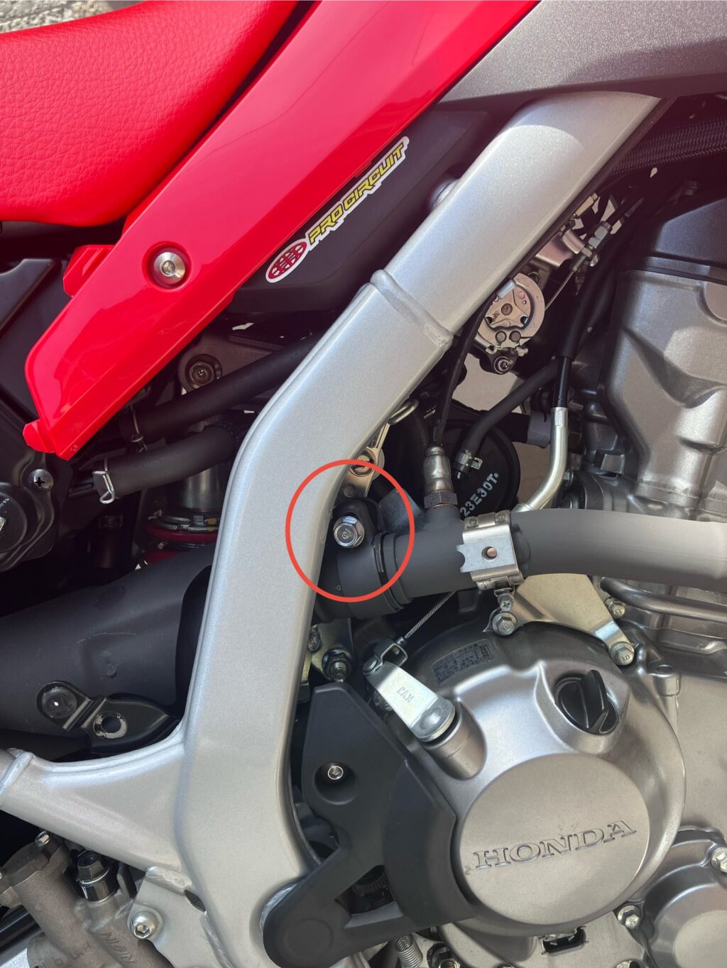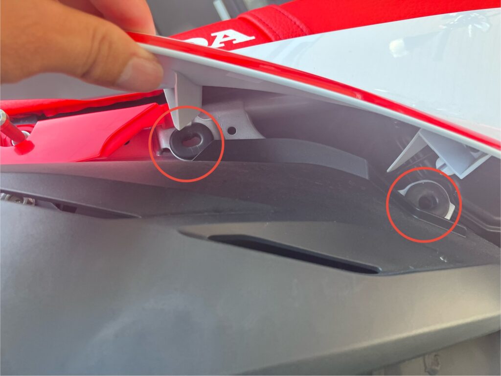 まずは外装のカウルを外します!赤丸部の二つのボルトを六角で緩めて、裏面のツメもゆっくり外していきます!