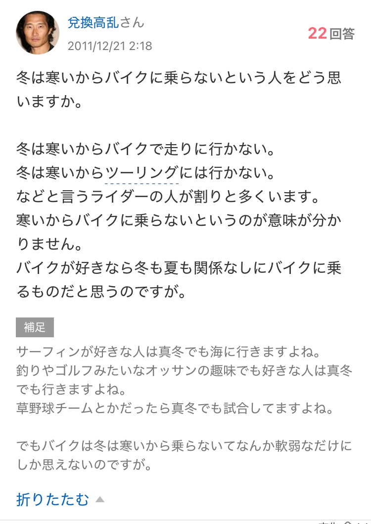 知恵袋質問者さんの様な方の意見は絶対に聞かず、一貫して冬は乗らずにバイクを全力で楽しんでください。